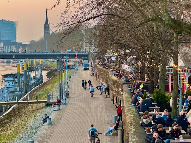 約 800 年の歴史を持つウォーターフロントの港地区「シュラハテ」は、緑が心地よいプロムナードになっており、ヴェーザー川沿いのテラスにレストラン、バー、パブが並ぶ一大グルメスポット。夕方から夜遅くまで賑わっており、川沿いの風情ある眺めとともに、名物のシーフードとローカルビールで地元の雰囲気が楽しめる。