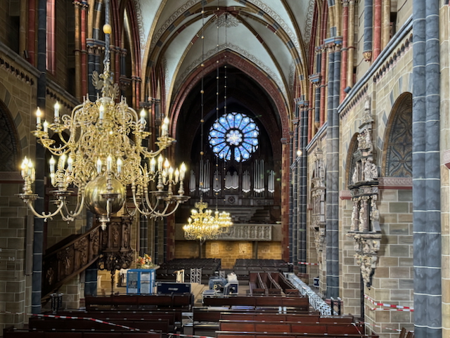 振り返れば、幻想的なバラ窓がまるで光の花のように輝いている。