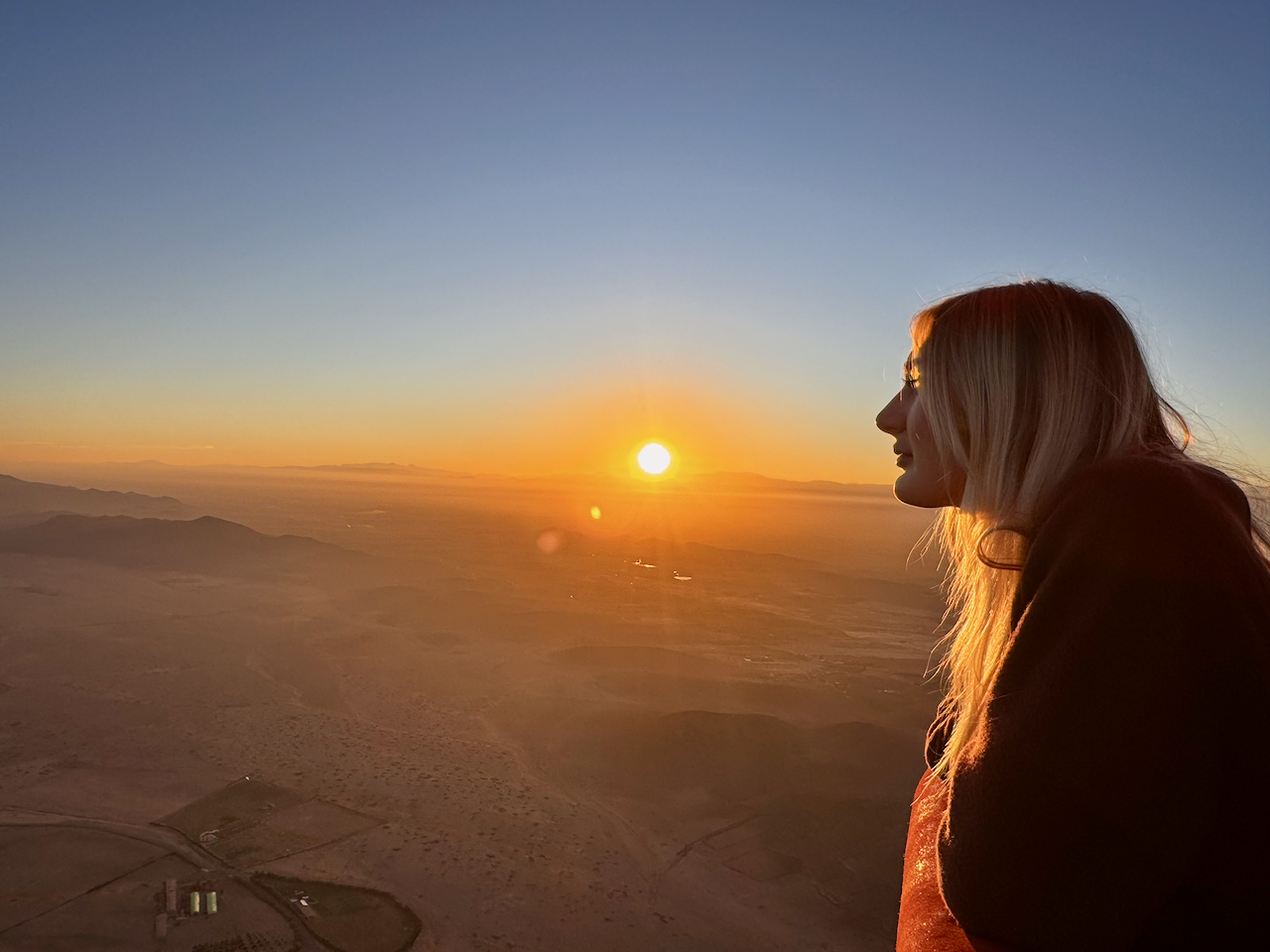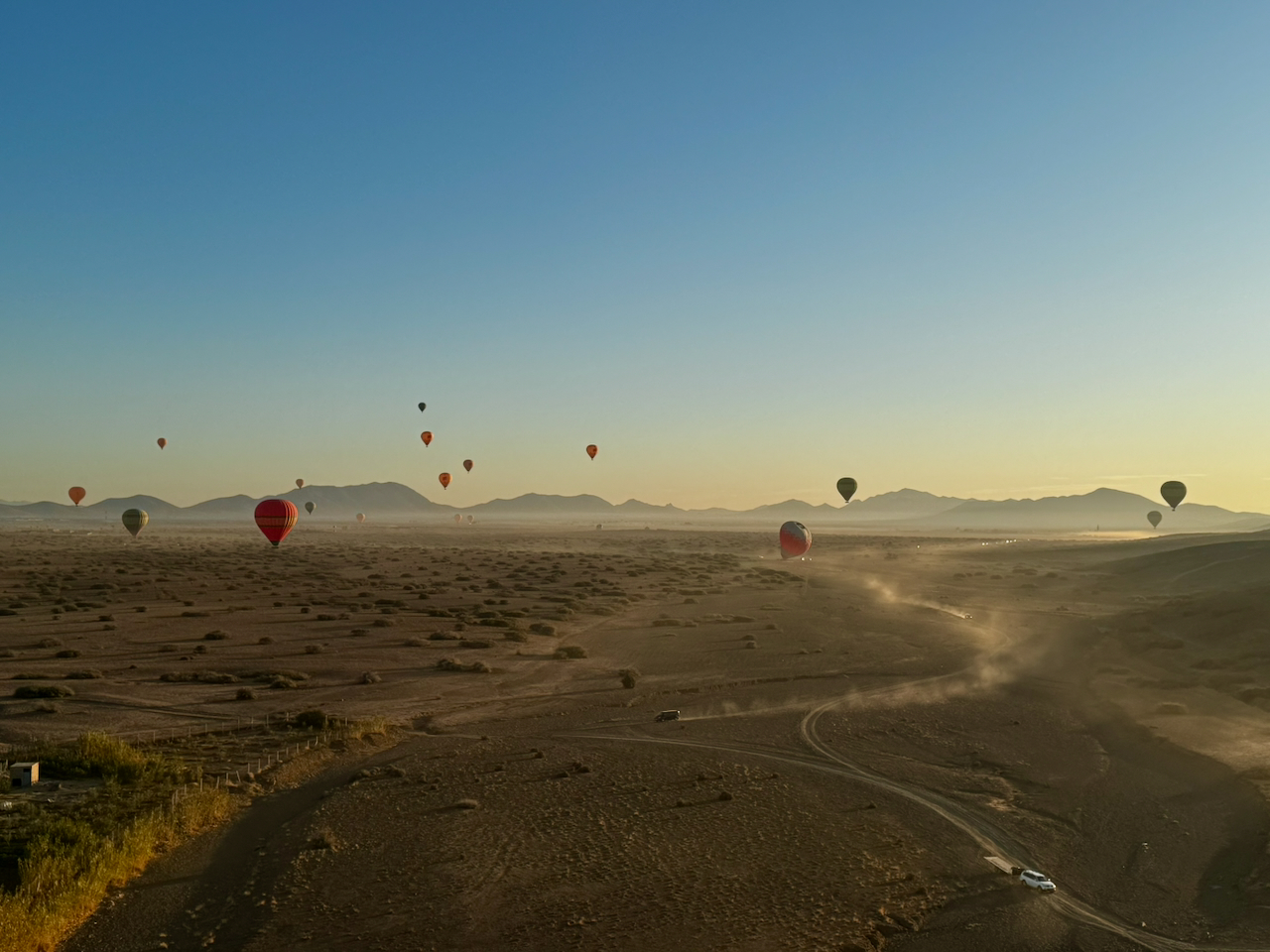 ツアー参加者をバスケットに乗せた気球は、赤い大地をゆっくりと離れ、青みがかった空に向かって浮き上がった。これから始まる1時間の空中遊泳にワクワクが止まらない。