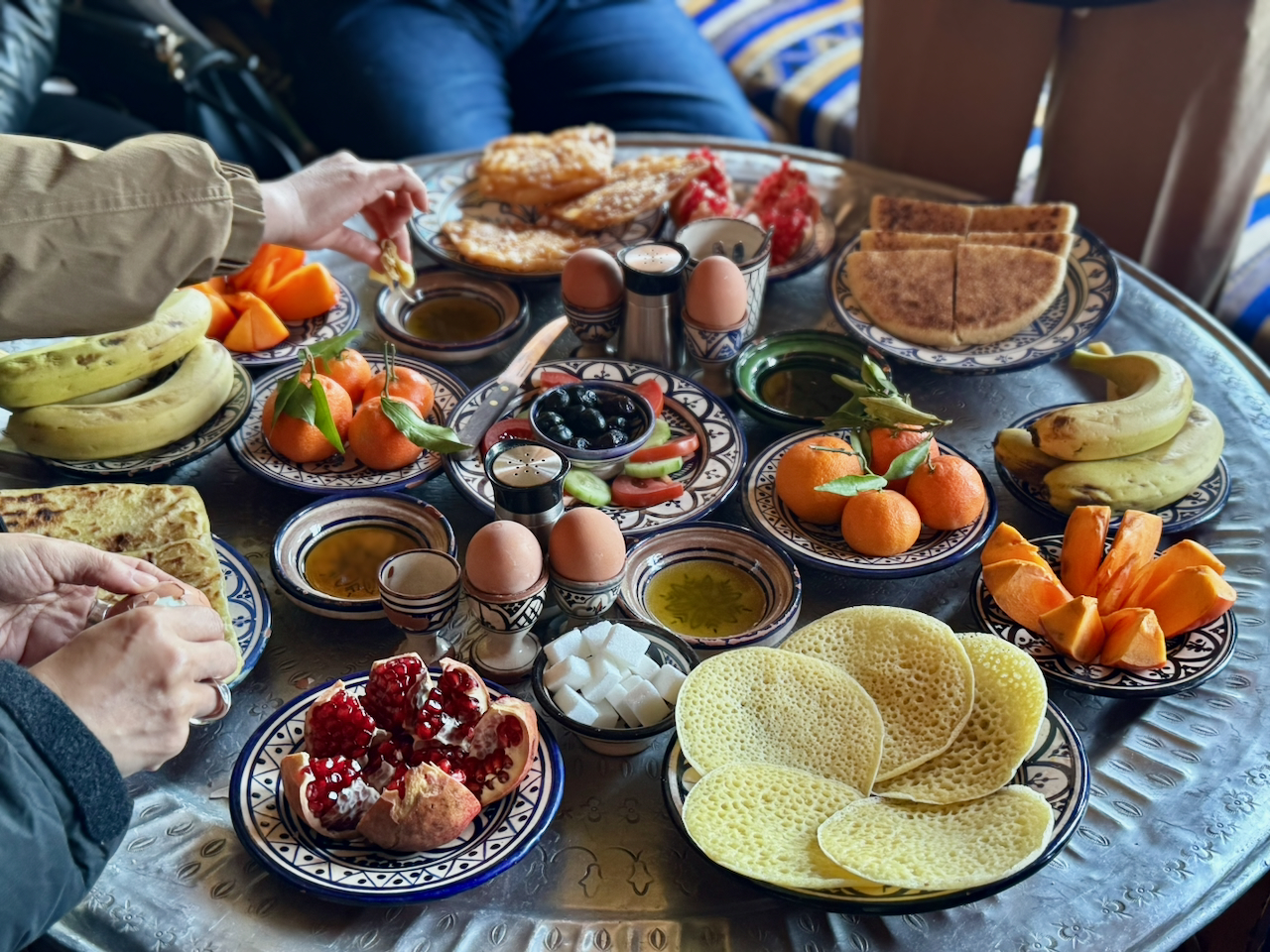 ベルベルの伝統的な朝食。ホブズ(パン)やムスンメン(セモリナ粉のクレープ)を中心に、蜂蜜、ジャム、オリーブオイル、アムルー(ナッツペースト)などを添えて食べ、甘いミントティーと共に楽しむ。豊富な果物、チーズ、サラダなども並び素朴ながらも彩り豊か。特にモロッコのフルーツは甘くて美味しい。ザクロおおいしかったけど、日本のような柿やみかんも甘くて最高!